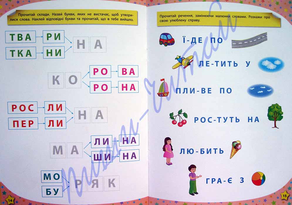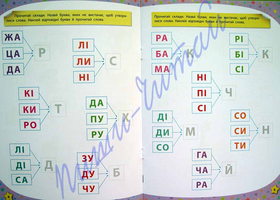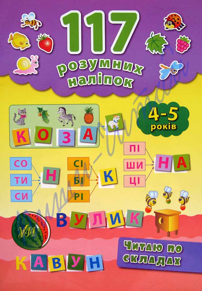 Книги серии "117 розумних наліпок" помогут малышам легко и весело освоить и закрепить основной материал дошкольного образования. Для выполнения всех заданий в книгах используются наклейки, что очень нравится детям. Такие занятия помогают малышам развивать внимание, мышление, улучшают память. Работа с наклейками также приучает ребёнка к аккуратности и развивает мелкую моторику рук, которая способствует развитию речи. С книгой "Читаю по складах 4-5 років" Ваш ребёнок повторит буквы украинского алфавита, потренируется составлять слова из слогов, а предложения - со слов с помощью рисунков и наклеек и, конечно, читать по слогам слова и предложения.