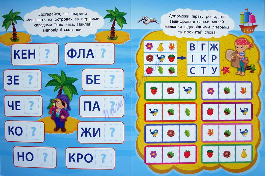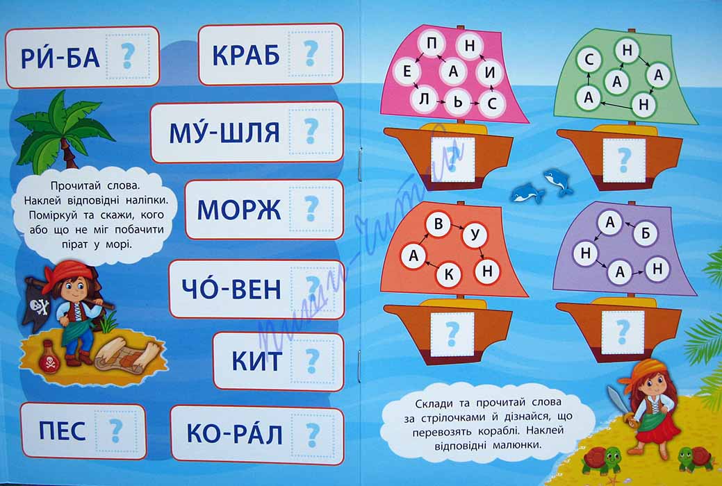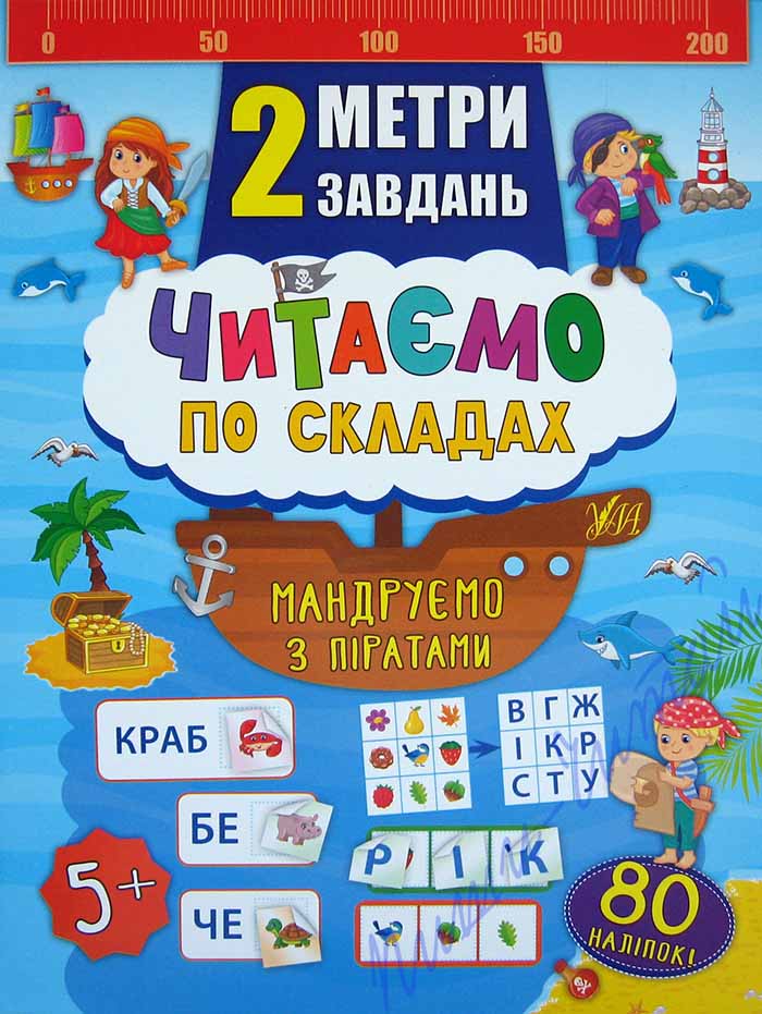 Акция! Цена снижена!!! Книжки серии «2 метри завдань» - отличный способ с пользой провести свободное время, помочь малышу легко и просто овладеть новыми знаниями, научить усидчивости и аккуратности. Большое количество разнообразных заданий, яркие иллюстрации, наклейки точно понравятся не только Вашему ребенку, а и его друзьям – ведь формат книжки-раскладушки как нельзя лучше подойдет для небольшой компании! Книжку можно развернуть на полу или на большом столе и играть всем вместе: в развернутом виде длина книжечки около 1м; а потом перевернуть и продолжить решать задачки! С книжкой «Читаємо по складах. Мандруємо з піратами» юные любители морских приключений поупражняются составлять слова из наклеек с буквами, вставлять пропущенную буквы в слово, выделять первую букву слова, решать головоломки с буквами и читать слова и словосочетания на любимую тематику. Попробуйте, и Вы очень скоро убедитесь, какие же это интересные и полезные книжечки!