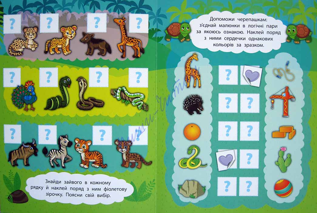 Акция! Цена снижена!!! Книжки серии «2 метри завдань» - отличный способ с пользой провести свободное время, помочь малышу легко и просто овладеть новыми знаниями, научить усидчивости и аккуратности. Большое количество разнообразных заданий, яркие иллюстрации, наклейки точно понравятся не только Вашему ребенку, а и его друзьям – ведь формат книжки-раскладушки как нельзя лучше подойдет для небольшой компании! Книжку можно развернуть на полу или на большом столе и играть всем вместе: в развернутом виде длина книжечки около 1м; а потом перевернуть и продолжить решать задачки! С книжкой «Логіка. Пригоди в джунглях» юные исследователи тропических лесов усовершенствуют навыки логического мышления: поупражняются в нахождении закономерностей, будут рассуждать на тему, чего не может быть, узнают обитателей джунглей по их теням и название фруктов по их серединкам, научатся объединять предметы в пары и группы по общему признаку, соберут пазл, потренируются решать задачки «что было раньше, а что потом», решат задачку, где потребуется знание счета до 10 и внимание. Попробуйте, и Вы очень скоро убедитесь, какие же это интересные и полезные книжечки!