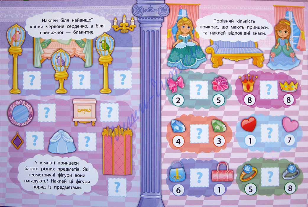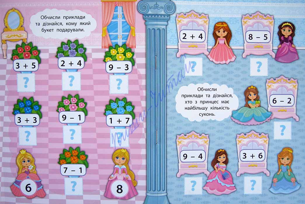 Акция! Цена снижена!!! Книжки серии «2 метри завдань» - отличный способ с пользой провести свободное время, помочь малышу легко и просто овладеть новыми знаниями, научить усидчивости и аккуратности. Большое количество разнообразных заданий, яркие иллюстрации, наклейки точно понравятся не только Вашему ребенку, а и его друзьям – ведь формат книжки-раскладушки как нельзя лучше подойдет для небольшой компании! Книжку можно развернуть на полу или на большом столе и играть всем вместе: в развернутом виде длина книжечки около 1м; а потом перевернуть и продолжить решать задачки! С книжкой «Математика. У замку принцеси» юные красавицы усовершенствуют свои математические навыки: повторят порядковый счет от 1 до 10, повторят названия геометрических фигур, понятия «самый высокий – самый низкий», «самый большой – самый маленький», сравнение чисел, поупражняются в решении простых примеров на сложение и вычитание в пределах 10. Тематические картинки и наклейки поддержат интерес ребенка и ускорят запоминание. Попробуйте, и Вы очень скоро убедитесь, какие же это интересные и полезные книжечки!