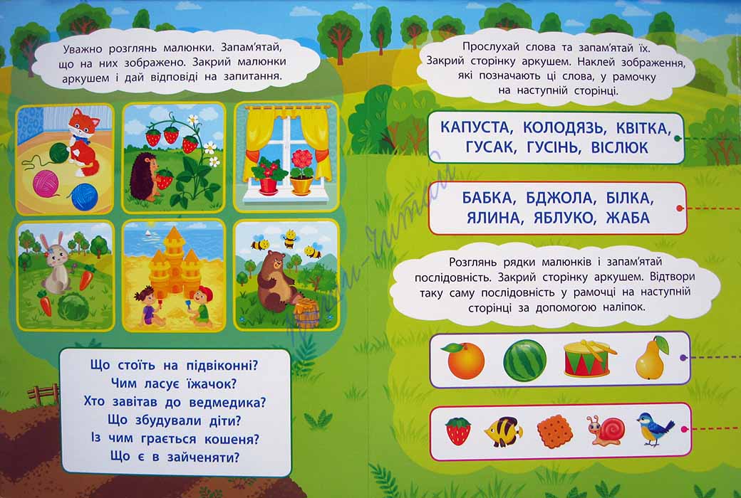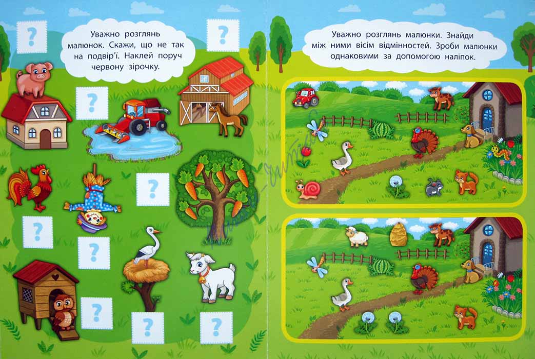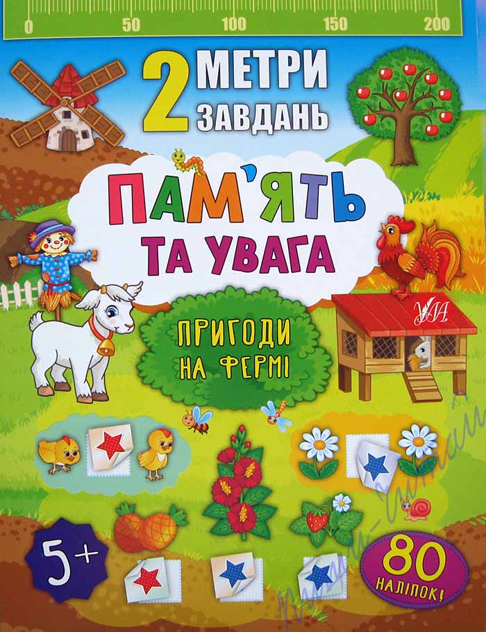 Акция! Цена снижена!!! Книжки серии «2 метри завдань» - отличный способ с пользой провести свободное время, помочь малышу легко и просто овладеть новыми знаниями, научить усидчивости и аккуратности. Большое количество разнообразных заданий, яркие иллюстрации, наклейки точно понравятся не только Вашему ребенку, а и его друзьям – ведь формат книжки-раскладушки как нельзя лучше подойдет для небольшой компании! Книжку можно развернуть на полу или на большом столе и играть всем вместе: в развернутом виде длина книжечки около 1м; а потом перевернуть и продолжить решать задачки! С книжкой «Пам'ять та увага. Пригоди на фермі» юные любители отдыха в селе и на ферме поупражняются в решении задачек на память и внимание: среди нарисованных растений найти те, что растут на ферме; по картинкам определить, чего не может быть; найти отличия между двумя картинками; найти одинаковые пары; рассмотреть картинки и, закрыв их, ответить на вопросы; прочитать слова на одной странице и, перевернув ее и не подсматривая, наклеить соответствующие картинки на другой странице. Попробуйте, и Вы очень скоро убедитесь, какие же это интересные и полезные книжечки!