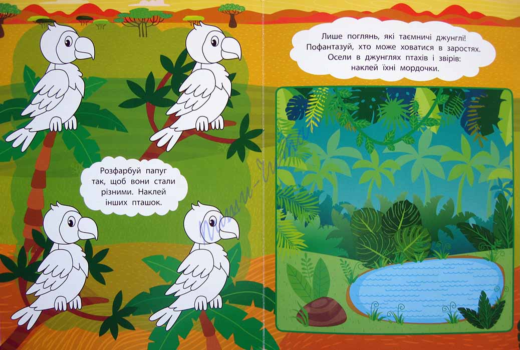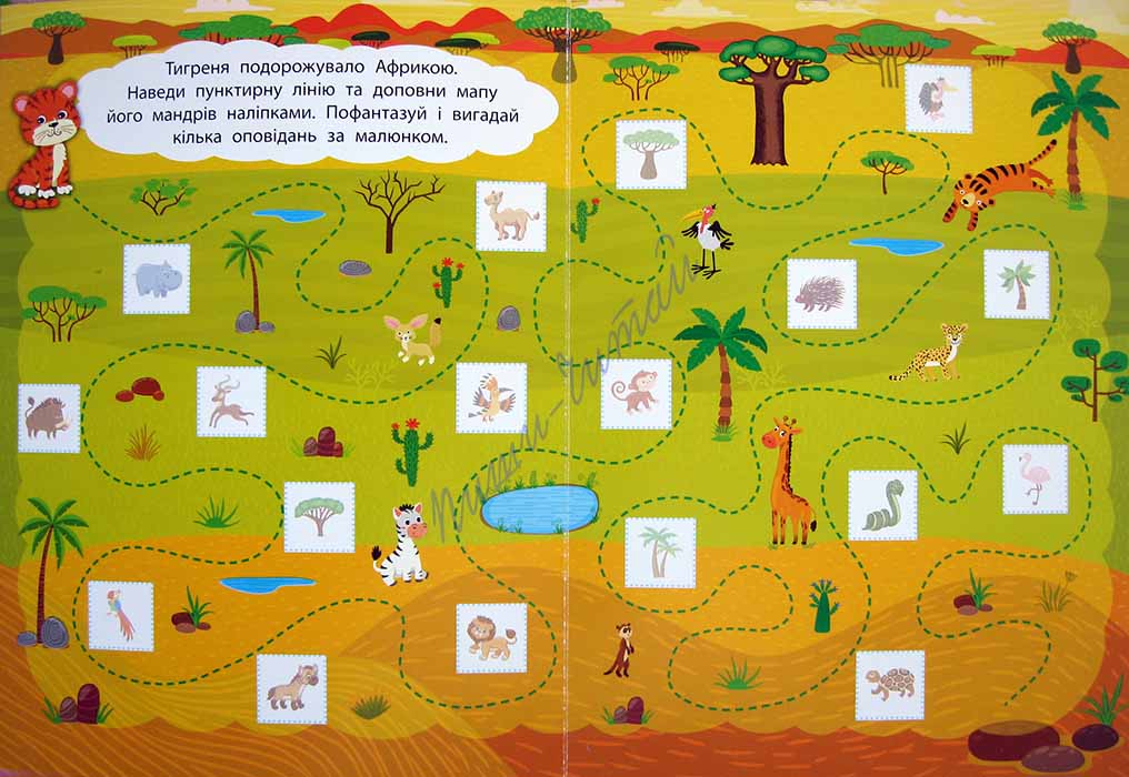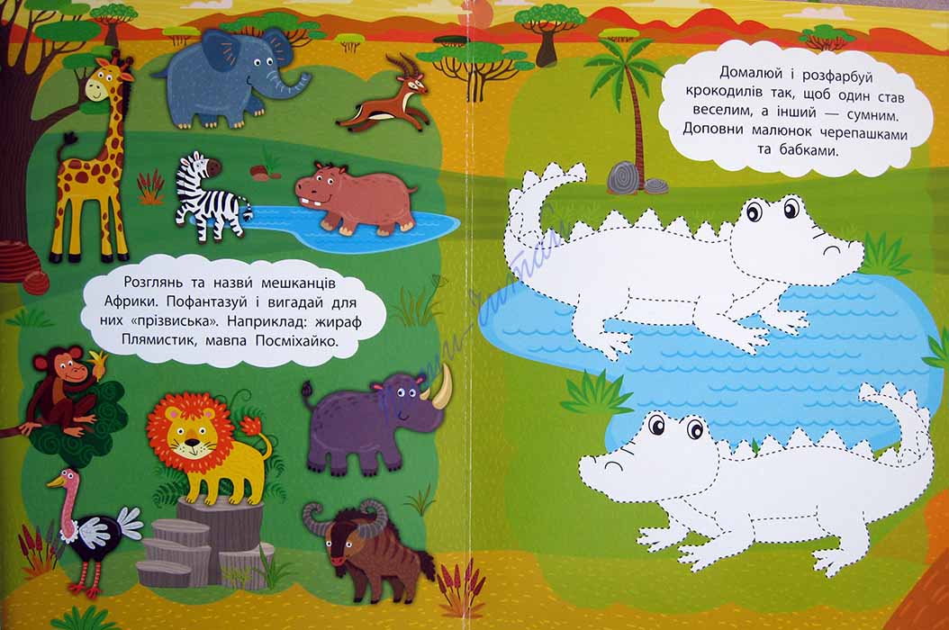 Акция! Цена снижена!!! Книжки серии «2 метри завдань» - отличный способ с пользой провести свободное время, помочь малышу легко и просто овладеть новыми знаниями, научить усидчивости и аккуратности. Большое количество разнообразных заданий, яркие иллюстрации, наклейки точно понравятся не только Вашему ребенку, а и его друзьям – ведь формат книжки-раскладушки как нельзя лучше подойдет для небольшой компании! Книжку можно развернуть на полу или на большом столе и играть всем вместе: в развернутом виде длина книжечки около 1м; а потом перевернуть и продолжить решать задачки! С книжкой «Розвиваємо фантазію. Африканські пригоди» юные любители жарких стран дадут волю своей фантазии и креативному мышлению. В книжке ребенок найдет разнообразные задания по рисованию и аппликации; придумает клички африканским животным; попробует поменять тела, лапы и хвосты разным животным; подумает, что бы съели на обед обезьянки; придумает свою удивительную историю о путешествии, размещая наклеечки и запоминая названия животных, птиц и растений. Попробуйте, и Вы очень скоро убедитесь, какие же это интересные и полезные книжечки!