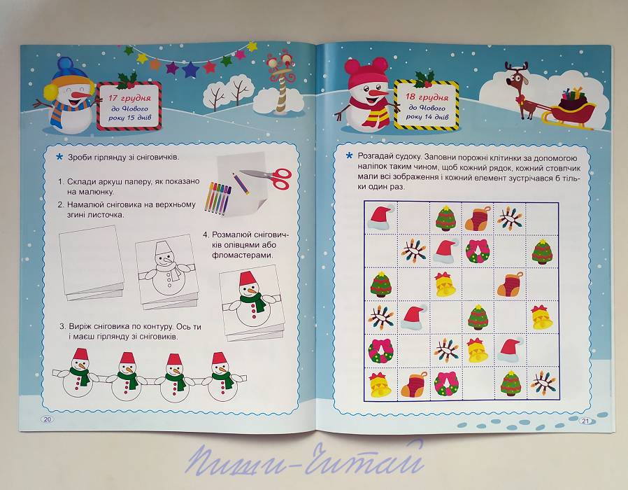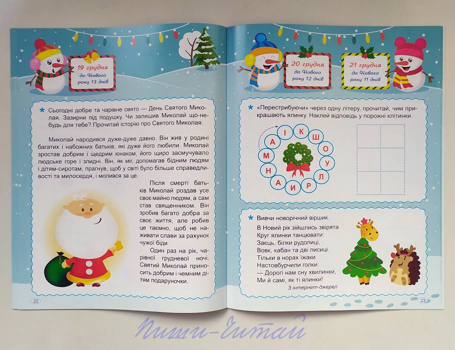 Увага! Ціну знижено (звичайна ціна 110грн). Усі діти із нетерпінням очікують найулюбленіше свято – Новий рік: чекають на здійснення бажань, дива, мріють про подарунки, смаколики і веселощі, зазирають у календар – чи багато днів залишилось до свята. І щоб очікування було не нудним, зимові вечори – цікавими, а дитина – щасливою, придбайте книжку «Адвент-календар. В очікуванні Нового року» від видавництва Торсінг. Якщо дитина вже навчилася читати і писати – впевнені , їй точно сподобається цей Адвент-календар. На дітлахів чекають тридцять один цікавий день: з 01 грудня і по 31 грудня включно діти виконуватимуть найрізноманітніші завдання на тему Різдва, Нового року, подарунків і зими: ребуси з буквами, ломиголовки , завдання на шифрування, кросворди , загадки, лабіринти, судоку, завдання «знайди та покажи», «знайди 10 відмінностей», завдання на розвиток логіки і уваги, прочитають легенду і казку, за допомогою інструкцій виготовлять саморобки на зимову тематику, заповнять анкети. Для розв'язування завдань використовуються наліпки, які ви знайдете всередині видання. Адвент-календар рекомендовано для дітей старшого дошкільного і молодшого шкільного віку. Повністю кольорове видання, обкладинка тонкий глянцевий картон. Книга українською мовою.