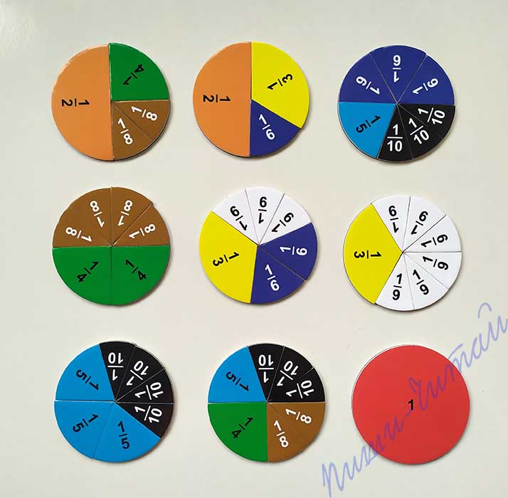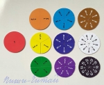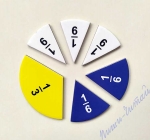 При вивченні уявлень про дроби в початковій школі учні мають певні труднощі: для того, щоб зрозуміти дроби і вивчити дії над ними, потрібно оволодіти механізмом спільних дій не над одним, а над двома числами. На першому етапі формування поняття про дроби вчителі радять спочатку використовувати життєвий досвід учнів по фактичному діленню різноманітних конкретних предметів на рівні частки, далі – запам’ятати назви частин цих предметів (половина, третина, чверть і т.д), і тільки потім перейти на назви отриманих частин дробами (одна друга, одна третя, одна четверта, і т.д.). На наступному, другому, етапі методисти радять ту ж саму роботу проводити на кресленнях або малюнках, поступово переходячи до операцій з дробами без зовнішньої опори. Дуже важливо, щоб посібники були не тільки в учителя, а й у кожного учня. Для реалізації наочної концепції вивчення дробив рекомендуємо використовувати роздатковий набір магнітних карток, до якого входять: один цілий круг і дев’ять кругів, розділений відповідно на 2,3,…10 однакових частин. Всі круги мають різні кольори, але однакові за розміром (діаметр 7см, товщина 3мм), кожна частка підписана відповідним дробом. Використовуючи такий набір для навчання, можна продемонструвати, що означає дріб (число над рискою і число під рискою в записі дробу), що при збільшенні числа під рискою (знаменника) частини зменшуються, можна продемонструвати, як утворюються частки практично (наприклад, щоб дістати одну четверту частку круга, треба круг поділити на чотири рівні частини і взяти одну таку частину), навчитися порівнянню дробив, наочно порівнюючи частки між собою; складаючи один круг з різних за розміром часток, можна показати якими різними способами можна отримати ціле число з дробив з різними знаменниками, а також зробити перші кроки по додаванню і відніманню дробив. Набір також можна використовувати як демонстраційний матеріал при розв’язування задач. Як наголошують методисти, правильні уявлення про частки, а пізніше про дроби будуть сформовані тоді, коли учні своїми руками діставатимуть, наприклад, половину круга, його чверть і т.д., а також в початковій школі рекомендують залишатися на такому рівні, коли дії з дробами здійснюються не за правилами, а на основі роздумів, які випливають із наочного уявлення. Всі картки магнітні, виробництво Україна.