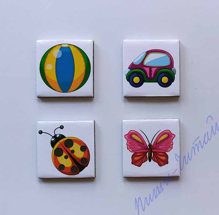 Дидактичний матеріал призначений для навчання дітей в закладах дошкільної освіти, в центрах розвитку, початкових школах та вдома. Доповнює і реалізує навчання дошкільників та учнів шкіл за будь-якою програмою, сприяє швидкому запам’ятовуванню, дає можливість кожному учню самостійно виконувати завдання і відтворювати весь навчальний матеріал, який вчитель за допомогою демонстраційних карток пояснює на дошці, дозволяє розв'язувати математичні задачі наочно, допомагає опанувати навички лічби. Кожна картка набору на магнітній основі (навчальний магніт), дуже легка за вагою, приємна на дотик, безпечна для дитини. Навчальні магніти мають товщину 3мм і розмір 24*24мм, тому з ними дуже зручно працювати: їх легко можна брати, перекладати, знімати з магнітної дошки, складати в коробку тощо. У набір входять картки із зображенням м'ячика, машинки, сонечка, метелика. Всього 40 магнітних карток (навчальних магнітів), по 10 штук кожного виду.