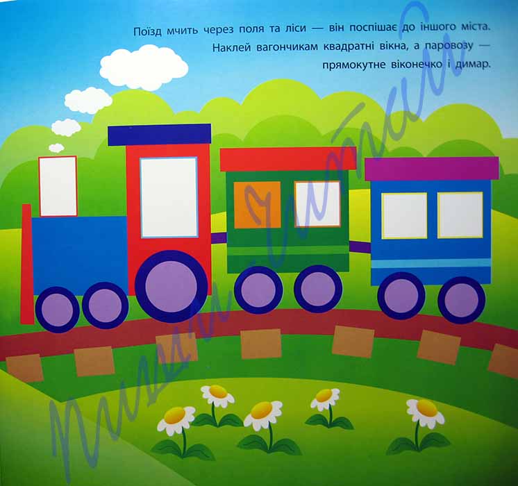 «Геометричні наліпки» – серия очень красивых книжек для малышей от 2-х лет. Яркие красочные картинки следует дополнить наклейками различных геометрических форм. Выполняя несложные и веселые задания детка легко запомнит названия фигур, научится узнавать их на рисунках и среди окружающих предметов, различать по цвету и форме. Задания в книжке – на украинском языке. Обратите внимание, что на картинках контур недостающей фигуры нарисован тем же цветом, что и соответствующая наклейка. В книжке «Квадратики та прямокутнички» клеим квадратные и прямоугольные наклейки разных цветов и размеров на картинки: окошки в вагонах поезда, панцирь черепашки, окна каюты парохода, полотенца, окна и двери домов, конфеты, новогодние подарки, корзина воздушного шара (всего 46 наклеек). Желаем успехов!
