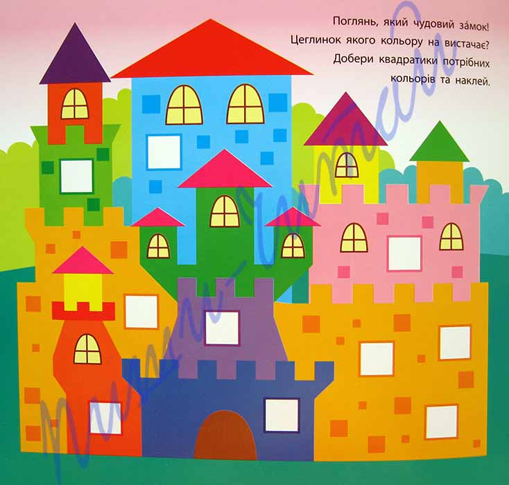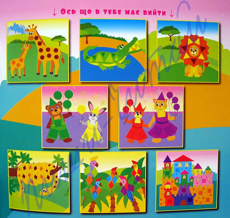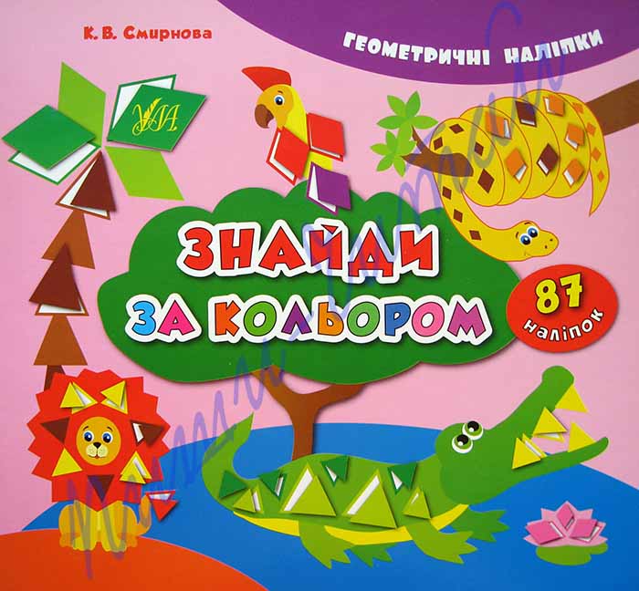 Книги этой серии познакомят детей с такими геометрическими фигурами, как квадрат, треугольник, круг и ромб, и научат узнавать их на рисунке среди других объектов, соотносить форму объекта или предмета с геометрической фигурой. Кроме этого, выполняя задания, малыш легко запомнит названия цветов и научится различать предметы и их фрагменты по размеру. Наклеивание мелких деталей приучает малышей к аккуратности и развивает мелкую моторику руки, что в свою очередь положительно влияет на развитие речи. В каждой книге 87 наклеек. В конце книги есть ответы: уменьшенные изображения страниц с правильно выполненными заданиями. Издание предназначено для совместной работы взрослого и ребёнка. В книжке "Знайди за кольором" на каждой странице следует вклеить геометрические фигуры одного, двух или максимально трёх типов. Фигуры на одной странице отличаются между собой по цвету (цвет контура соответствует цвету фигуры) и форме. Страницы книг из плотной глянцевой бумаги, поэтому если ребенку не удалось справиться с заданием с первого раза, то можно отклеить наклеечку и приклеить правильно.