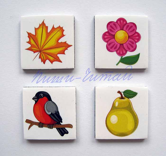 Дидактичний матеріал призначений для навчання дітей в закладах дошкільної освіти, в центрах розвитку, початкових школах та вдома. Доповнює і реалізує навчання дошкільників та учнів шкіл за будь-якою програмою, сприяє швидкому запам’ятовуванню, дає можливість кожному учню самостійно виконувати завдання і відтворювати весь навчальний матеріал, який вчитель за допомогою демонстраційних карток пояснює на дошці, дозволяє розв'язувати математичні задачі наочно, допомагає опанувати навички лічби. Кожна картка набору на магнітній основі (навчальний магніт), дуже легка за вагою, приємна на дотик, безпечна для дитини. Навчальні магніти мають товщину 3мм і розмір 24*24мм, тому з ними дуже зручно працювати: їх легко можна брати, перекладати, знімати з магнітної дошки, складати в коробку тощо. У набір входять картки із зображенням груши, кленового листочка, пташки, квітки. Всього 40 магнітних карток (навчальних магнітів), по 10 штук кожного виду.