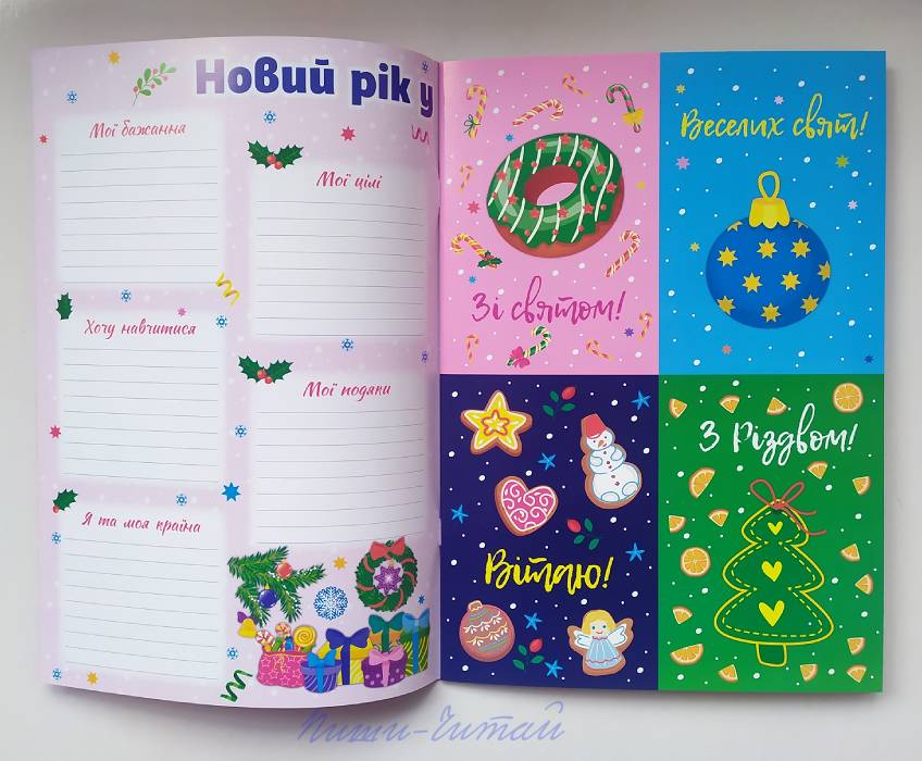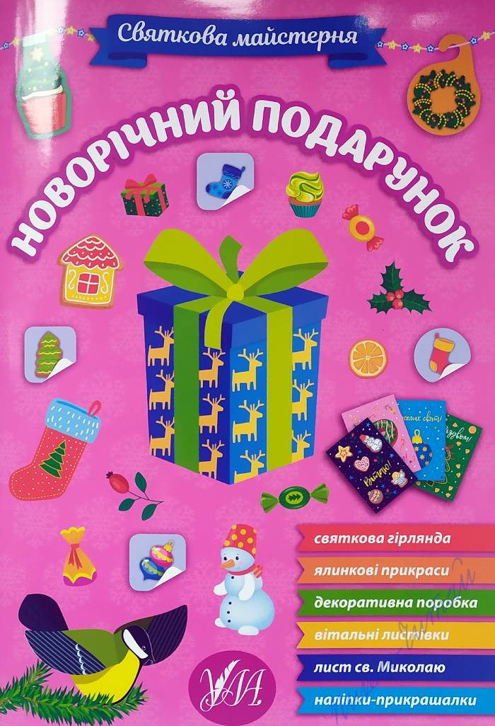 З книжками нової серії видавництва УЛА «Святкова майстерня» Ваша дитина якнайкраще підготується до святкування найочікуваніших зимових свят! Із виготовленими власноруч гірляндами, фігурками і прикрасами Ваша оселя набуде чудової святкової атмосфери. Рідні, близькі та друзі щиро зрадіють оригінальним вітальним листівкам. Складаючи лист Святому Миколаю, дитина замислиться над тим, чого б вона хотіла найсильніше. У дитячій кімнаті з'явиться гарний плакат-анкета, яку дитина заповнюватиме протягом року ( «Мої бажання», «Мої цілі», «Хочу навчитися», «Мої подяки», «Я та моя країна», «Мої ідеї», «Я та мої друзі», «Хочу побувати», «Я та моя родина», «Цікаві моменти року»). Із книжкою «Новорічний подарунок» майструємо святкову гірлянду, оформлюємо чотири вітальні листівки («Зі святом!», «Веселих свят!», «Вітаю!», «З Різдвом»), вирізаємо і складаємо фігурки снігура і синиці, склеюємо конверт для листа Святому Миколаю, прикрашаємо наліпками подарунки для рідних та друзів. Книга рекомендована для спільної роботи дорослих з дітьми дошкільного та молодшого шкільного віку. Висока якість поліграфії, повнокольорове видання, цупкий папір сторінок із елементами саморобок, наліпки м'яка обкладинка (глянцевий картон). Книга українською мовою