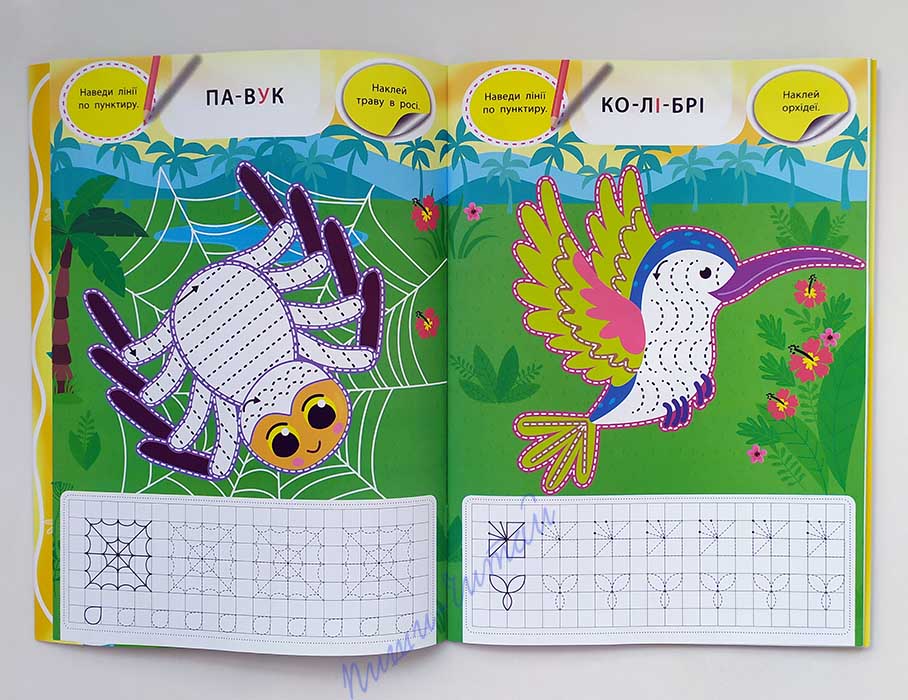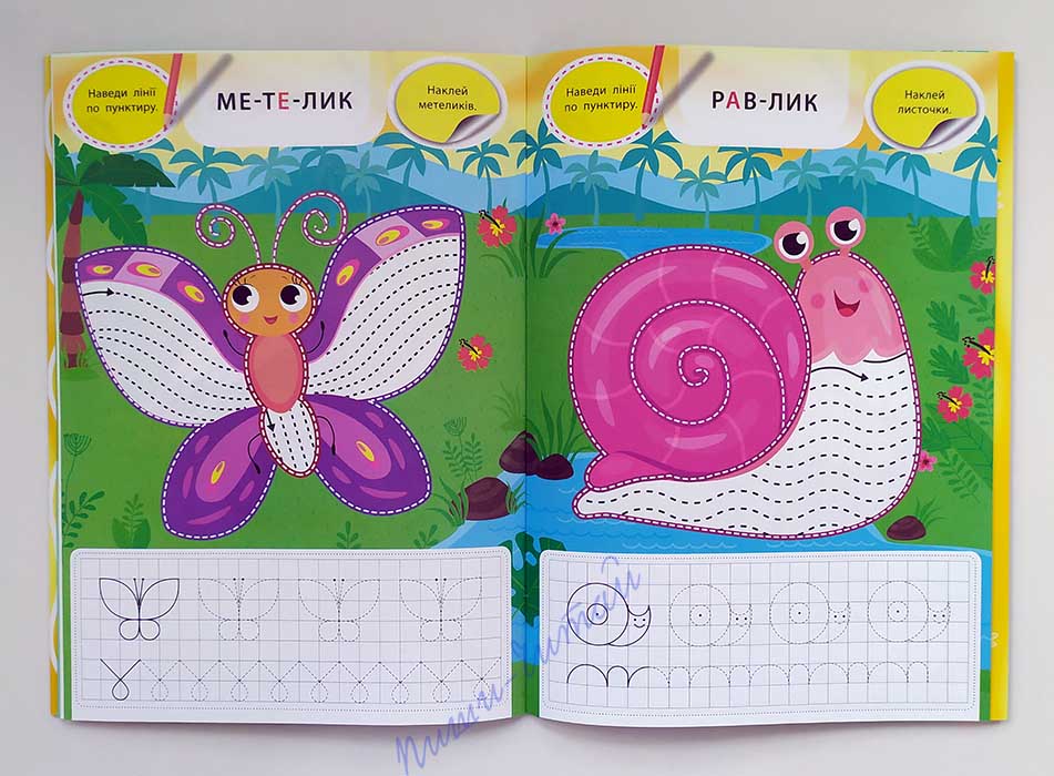 АКЦІЯ! кількість книжок за зниженими цінами обмежено! Встигніть купити за вигідною ціною: діюча ціна 43,90грн, акційна ціна 35,50грн!!! Серія «Творча майстерня з наліпками» - яскраві і змістовні книжки, з якими дуже просто організувати цікаве й пізнавальне дозвілля дошкільників. Одна сторінка – одне заняття. Спочатку прочитайте ім’я героя сторінки, яке написано по складах, звернув увагу, що в двоскладових словах наголошена голосна виділена червоним кольором. Кольоровим олівцем обведіть зображення героя по контуру, а також виконайте штрихування по пунктиру. Бажано, щоб кожну окрему лінію дитина писала, не відриваючи руки від письма. Потім запропонуйте розмалювати героя: підкажіть дитині, якою тваринка є в природі, але й не стримуйте фантазію дитини. В книзі «Метелик і його друзі» розмалюйте папугу, павука, колібрі, павича, тетерука, фламінго, журавля, метелика, равлика, жука, фенека, лебедя. Далі виконайте завдання з наліпками: прочитайте завдання у верхньому кутку сторінки, знайдіть наліпки всередині книги, наклейте. Не забувайте при цьому використовувати слова, що означають положення одного предмета відносно інших (зверху, знизу, поряд і т.і.), порахуйте, скільки наліпок ви наклеїли на сторінку, розгляньте їх детально. Наступне завдання – малювання по клітинках (клітинки збільшеного розміру, малюнок нанесено пунктиром). Не поспішайте – можливо дитині буде важко виконати таке завдання одразу, зробіть перерву або поверніться до нього наступного дня. Обов’язково підтримуйте дитину в намаганні писати акуратно, слідкуйте за поставою. Розмалюйте отримані фігурки і орнаменти на ваш розсуд. Під час перерви пройдіть лабіринтом: знайдіть найкоротший і найдовший шлях до цілі, називайте всіх, кого зустрічаєте, також радимо називати напрямок пересування (праворуч, ліворуч, вперед, назад). Перша сторінка книжки – це шаблон для виготовлення фоторамки для фото 10*15см. Допоможіть дитині канцелярським ножем вирізати рамку по контуру, вставьте в прорізи фото. Остання сторінка книжки – шаблон для виготовлення двох іграшок (папуга і лебідь): виріжте ножицями по контуру іграшки і деталі підставки, з’єднайте між собою. Іграшки можна використати під час гри, домашнього театру або оформлення дитячої кімнати. Отже, грайте, навчайтесь, розвивайтесь з радістю! Книги українською мовою, сторінки для творчості і конструювання з глянцевого картону, 37 наліпок в кожній книжці.