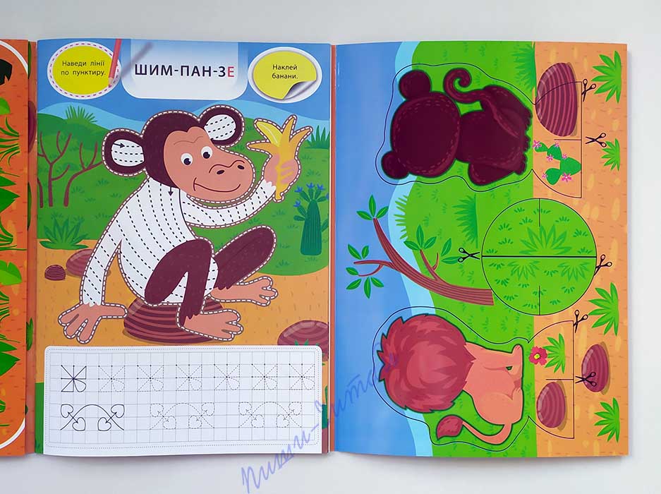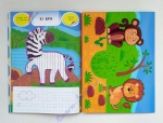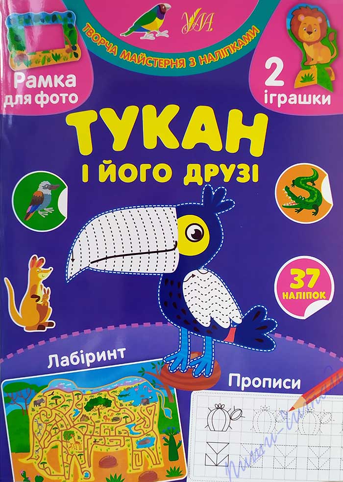 АКЦІЯ! кількість книжок за зниженими цінами обмежено! Встигніть купити за вигідною ціною: діюча ціна 43,90грн, акційна ціна 35,50грн!!! Серія «Творча майстерня з наліпками» - яскраві і змістовні книжки, з якими дуже просто організувати цікаве й пізнавальне дозвілля дошкільників. Одна сторінка – одне заняття. Спочатку прочитайте ім’я героя сторінки, яке написано по складах, звернув увагу, що в двоскладових словах наголошена голосна виділена червоним кольором. Кольоровим олівцем обведіть зображення героя по контуру, а також виконайте штрихування по пунктиру. Бажано, щоб кожну окрему лінію дитина писала, не відриваючи руки від письма. Потім запропонуйте розмалювати героя: підкажіть дитині, якою тваринка є в природі, але й не стримуйте фантазію дитини. В книзі «Тукан і його друзі» розмалюйте шимпанзе, тигра, ягуара, бегемота, тукана, лінивця, хамелеона, єхидну, лева, жирафу, слона, зебру. Далі виконайте завдання з наліпками: прочитайте завдання у верхньому кутку сторінки, знайдіть наліпки всередині книги, наклейте. Не забувайте при цьому використовувати слова, що означають положення одного предмета відносно інших (зверху, знизу, поряд і т.і.), порахуйте, скільки наліпок ви наклеїли на сторінку, розгляньте їх детально. Наступне завдання – малювання по клітинках (клітинки збільшеного розміру, малюнок нанесено пунктиром). Не поспішайте – можливо дитині буде важко виконати таке завдання одразу, зробіть перерву або поверніться до нього наступного дня. Обов’язково підтримуйте дитину в намаганні писати акуратно, слідкуйте за поставою. Розмалюйте отримані фігурки і орнаменти на ваш розсуд. Під час перерви пройдіть лабіринтом: знайдіть найкоротший і найдовший шлях до цілі, називайте всіх, кого зустрічаєте, також радимо називати напрямок пересування (праворуч, ліворуч, вперед, назад). Перша сторінка книжки – це шаблон для виготовлення фоторамки для фото 10*15см. Допоможіть дитині канцелярським ножем вирізати рамку по контуру, вставьте в прорізи фото. Остання сторінка книжки – шаблон для виготовлення двох іграшок (мавпочка і лев): виріжте ножицями по контуру іграшки і деталі підставки, з’єднайте між собою. Іграшки можна використати під час гри, домашнього театру або оформлення дитячої кімнати. Отже, грайте, навчайтесь, розвивайтесь з радістю! Книги українською мовою, сторінки для творчості і конструювання з глянцевого картону, 37 наліпок в кожній книжці.